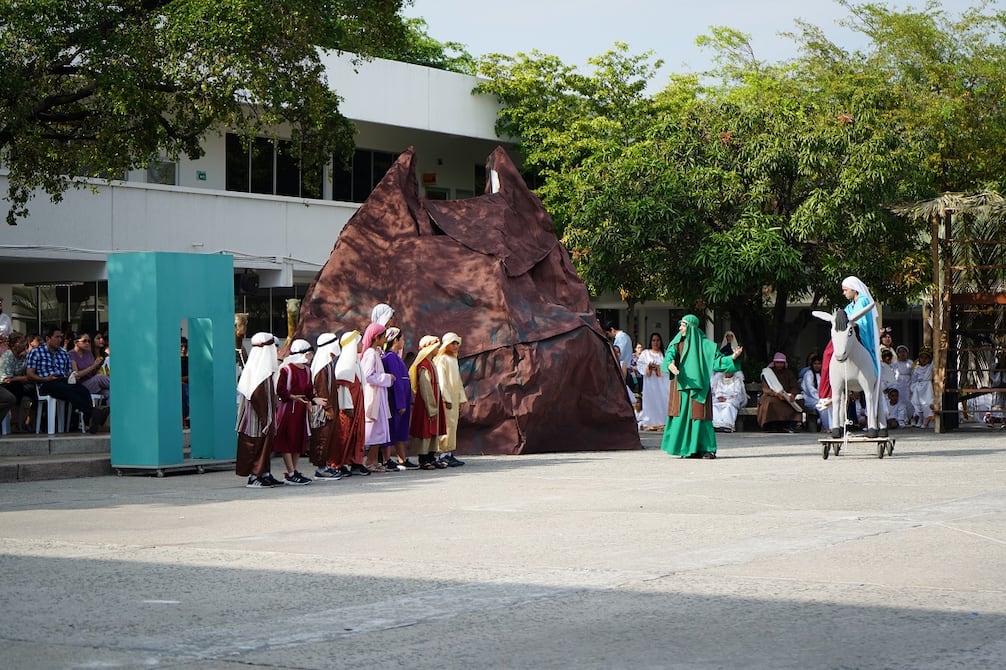 Estudiantes de entre 6 y 11 años del Instituto Particular Abdón Calderón (IPAC) participaron en la presentación de una nacimiento viviente en la unidad educativa ubicada en el km 1,5 de la avenida Samborondón.