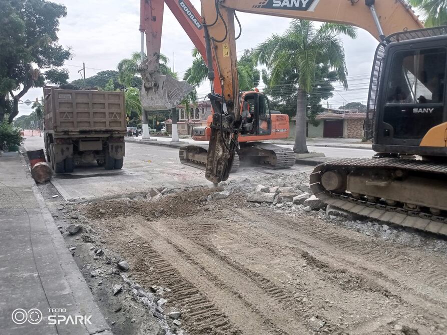 Equipos de la Dirección de Obras Públicas se encargan de la remoción del pavimento rígido de la calle Cornejo Montalván, entre las avenidas Cayetano Tarruel y Luis Noboa, en el sector de Los Esteros, en el sur de Guayaquil.