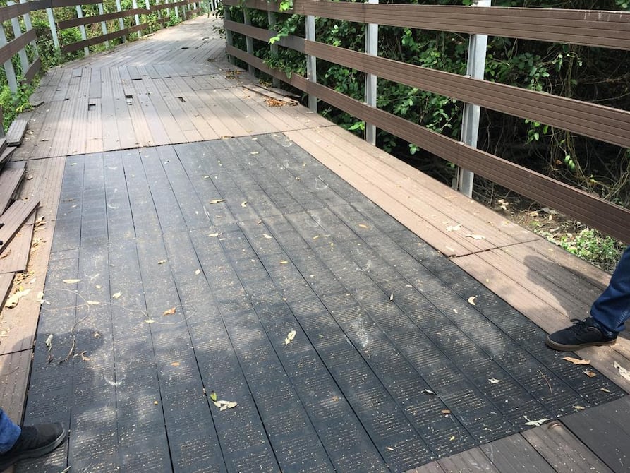En el tramo del sendero Guayaquil-isla Santay, de 2,6 kilómetros de longitud, se han instalado 750 tablones de caucho de neumáticos en reemplazo de las tablas de madera plástica en las que por su deterioro se han formado huecos de grandes dimensiones.