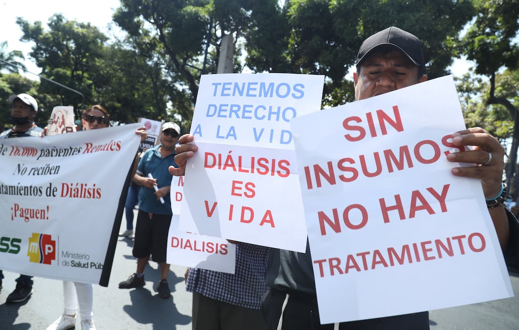Unos 300 pacientes renales y sus familiares llegaron la mañana de este miércoles, 31 de julio, hasta los exteriores de la Gobernación del Guayas para protestar por la deuda que mantiene el Estado con las clínicas dializadoras, lo que impide que sigan recibiendo el tratamiento que requieren para vivir.