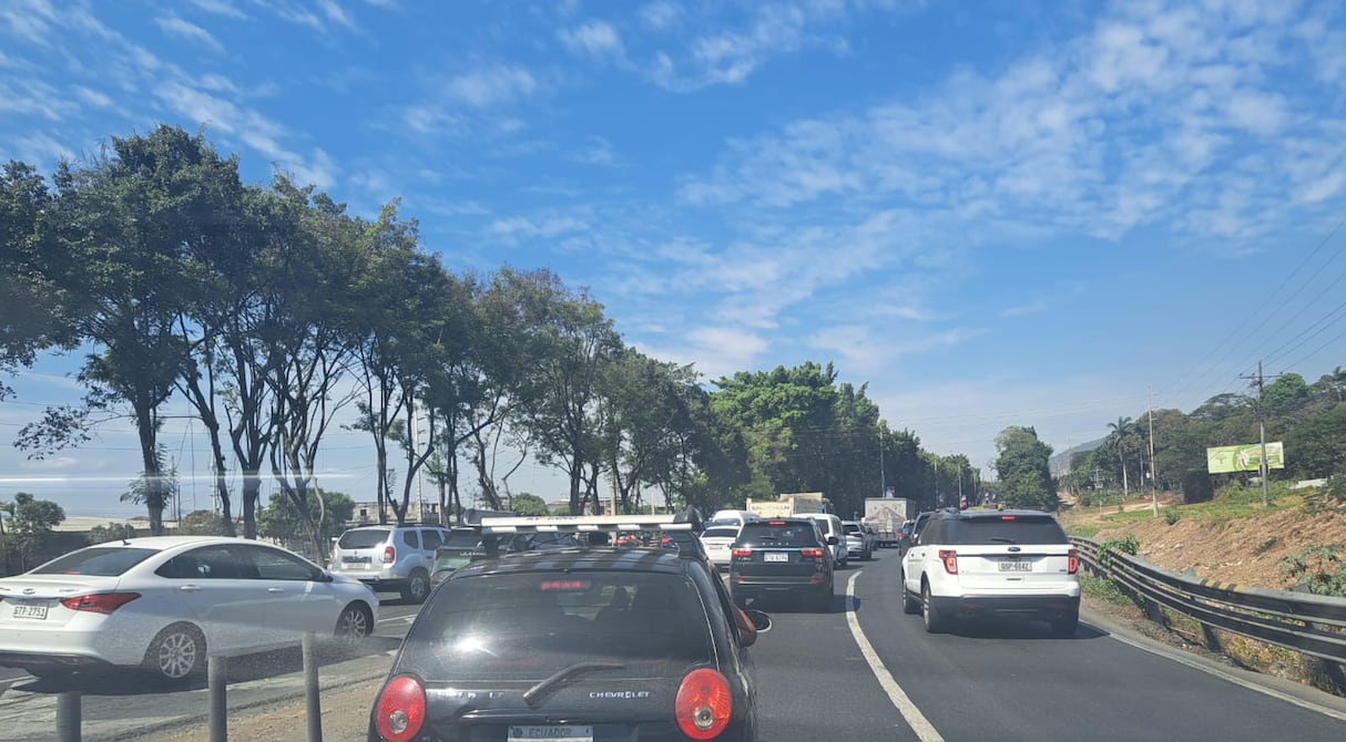 Desde el sector de la Escuela Superior Politécnica del Litoral (Espol) se observó una alta demanda de vehículos pasadas las 10:00. Los tres carriles estaban llenos y los automotores avanzaban de a poco.