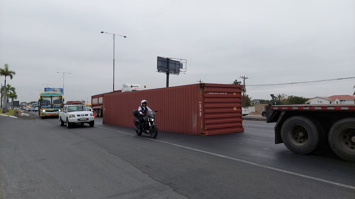 El siniestro involucró un automóvil rojo y un tráiler que transportaba un contenedor.