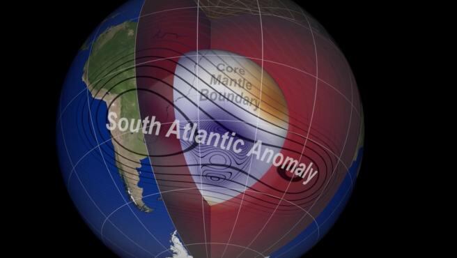 Sobre América del Sur está evolucionando un punto débil en el campo magnético de la Tierra. Llamada la 'Anomalía del Atlántico Sur', esta región única se ha estado expandiendo durante una década y los científicos de la NASA creen que está comenzando a dividirse en dos zonas distintas.