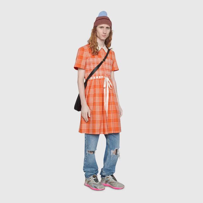 Con el objetivo de romper los 'estereotipos tóxicos' que 'moldean' la identidad de género masculina, la firma italiana Gucci sacó a la venta una blusa larga tipo vestido para hombre, elaborado en tartán naranja, con un detalle de lazo de satén.