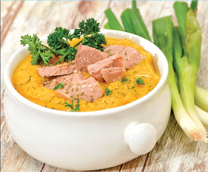• Hervir a fuego lento hasta que la mezcla quede cocida y espesa. Agregar el pescado cortado en trozos, cilantro picado y dejar cocer por unos pocos minutos.