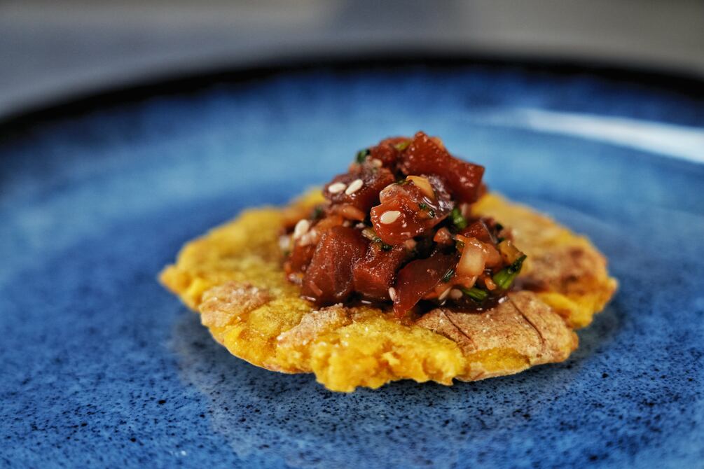 Tartar de atún, sazonado con neapia, sobre patacones