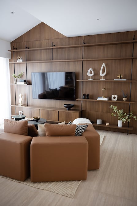 El sofá, pieza central de la sala, se eligió por su comodidad y proporción, convirtiéndose en el eje visual del espacio.