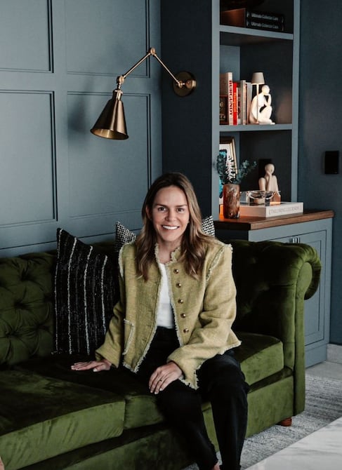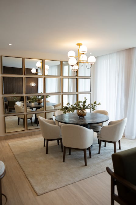 “Quise crear profundidad y carácter con un juego de espejos enmarcados en dorado envejecido. La mesa, una verdadera pieza de diseño, combina una cubierta de granito con una base de discos cónicos que aportan movimiento y presencia. Las sillas tapizadas, con sutiles toques de madera, equilibran la calidez del conjunto. Y la lámpara completa el espacio con un toque final de elegancia y luz envolvente”, dice Denisse Ortega, decoradora.