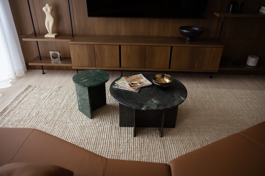 Lo acompaña un juego de mesas en mármol natural verde, que aporta textura y sofisticación. Al fondo, un panelado en madera con repiseros metálicos, que realza la pared y añade profundidad y carácter, integrando funcionalidad y diseño.