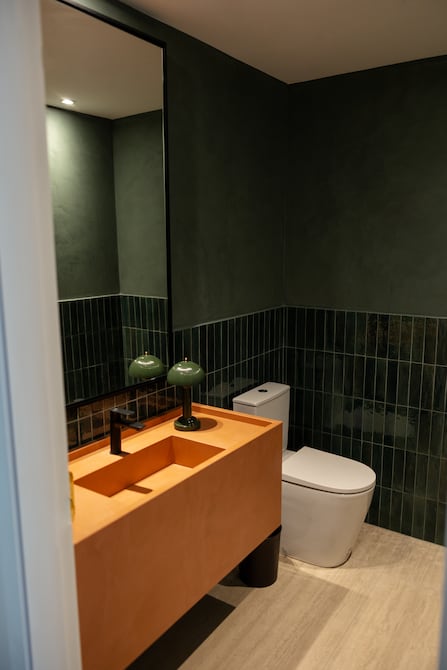 Limewash en las paredes hasta media altura, para el baño de visitas, combinado con subway tiles para aportar textura y contraste. Y la paleta monocromática rompe intencionalmente con el mesón, aportando un toque vibrante y original. (I)