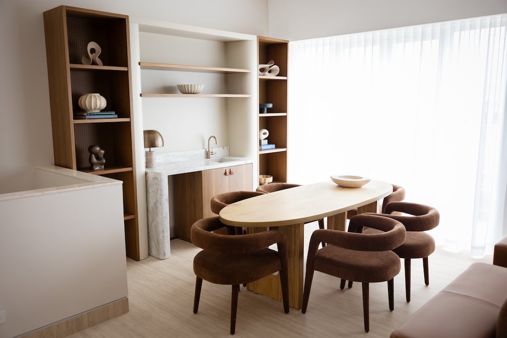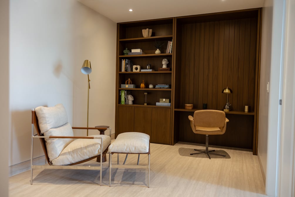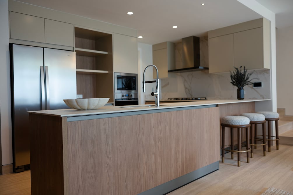 El conjunto se complementa con una barra de madera natural y detalles metálicos vistos, que aportan carácter y contraste, explica Dennis Ortega.