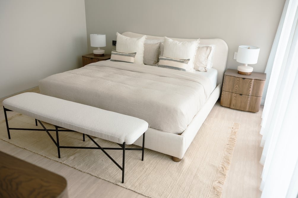 “La paleta neutra de colores aporta equilibrio y calidez. Se jugó con materiales y texturas como veladores enchapados con formas orgánicas, una cama tapizada y un bench de estructura metálica con tapizado suave", agrega Denisse.