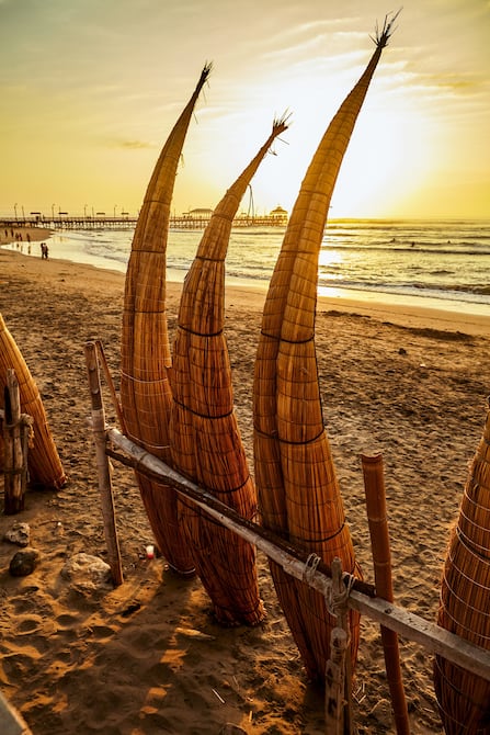 Cerca también se encuentra Chan Chan, la ciudad de adobe más grande de América precolombina que fue declarada patrimonio mundial por la Unesco. A pocos minutos, el balneario de Huanchaco ofrece una de las postales más icónicas de la costa peruana, donde pescadores aún navegan sobre tradicionales caballitos de totora.