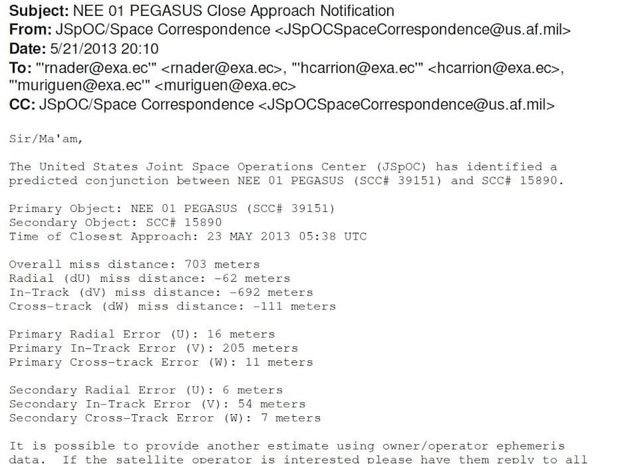 En una notificación del "Joint Space Operations Center" se alerta sobre la posibilidad del suceso, que se estima podría darse el día jueves 23 de mayo, a las 00:38 de Ecuador (05:38 UTC).