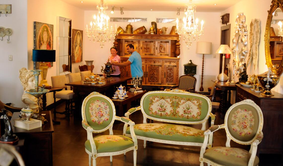 Es como estar en otro mundo cuando se visita una galería de antigüedades. Las lámparas grandes, los muebles forrados con gamuza y los adornos hechos con vidrios de colores te trasladan a otras épocas.