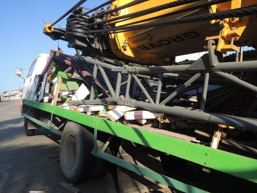 Dos de los 8 pasajeros de una ranchera, más comúnmente llamadas chivas, resultaron con heridas, cuando una pesada grúa, de 50 toneladas, cayó desde una plataforma que era trasladada hacia San Lorenzo, en Esmeraldas, para realizar trabajos de construcción.
