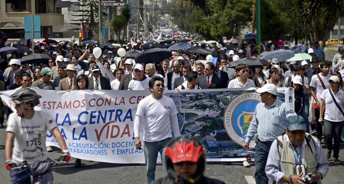 Una marcha de estudiantes, docentes y trabajadores de la Universidad Central del Ecuador se tomó este miércoles las calles para protestar por la categorización “B” que determinó el Ceaaces luego de una evaluación.