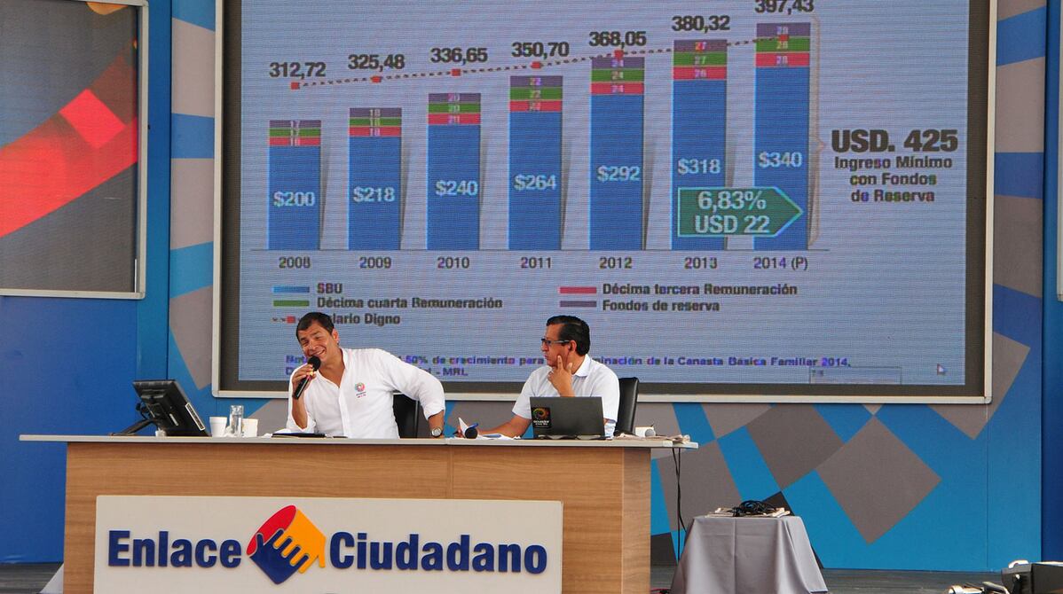 En medio de un ambiente preelectoral, el presidente Rafael Correa realizó su último enlace sabatino del año en el sector de Monte Sinaí, en el noroeste de Guayaquil, desde donde anunció que el salario básico que regirá en el 2014 será de $ 340.