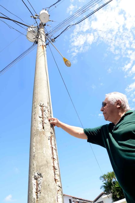 “Es un riesgo vivir junto a estos postes. Con un fuerte sismo es muy probable que se derrumben y causen daños humanos y materiales”, así se quejó hace tres años Eduardo Intriago, residente de Entre Ríos, en CNEL por el mal estado de los postes de luz. El problema continúa.