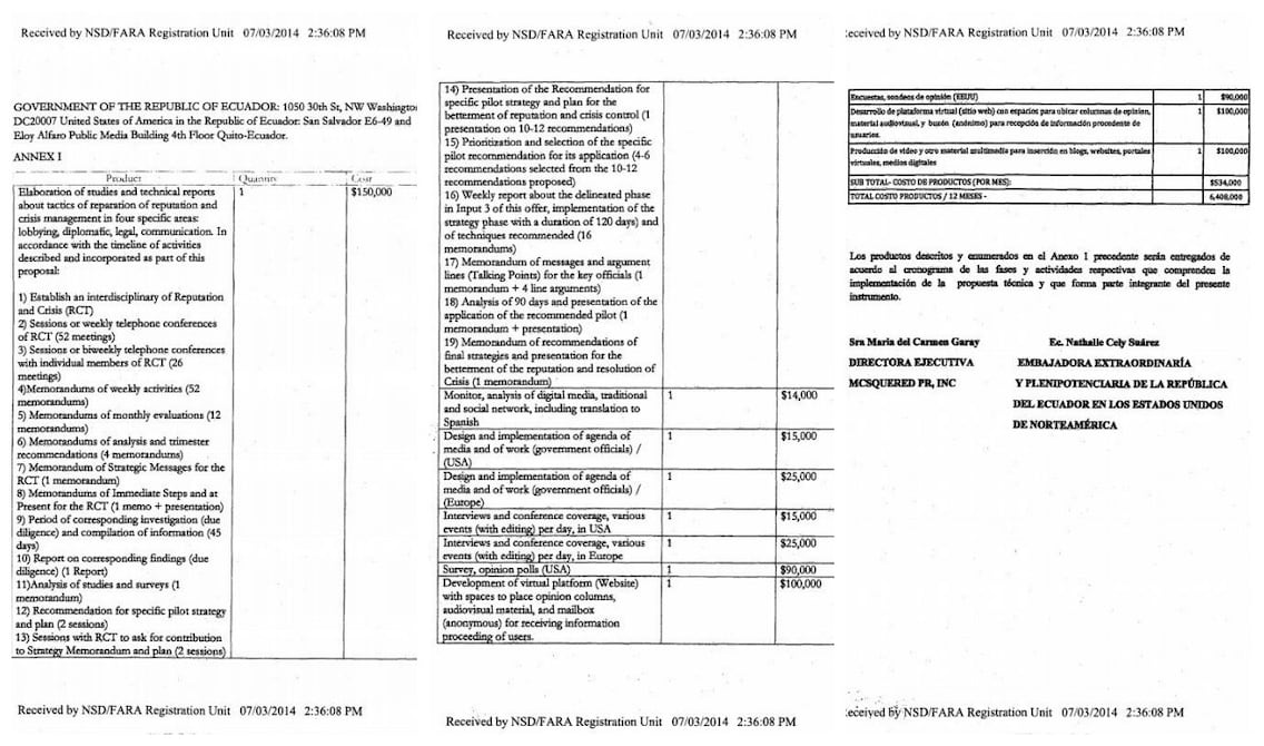 Documentos difundidos por el Departamento de Justicia muestran un contrato en el que Ecuador se comprometió a pagar $ 6'408.000 a la agencia de relaciones públicas MCSquared, con sede en Nueva York.