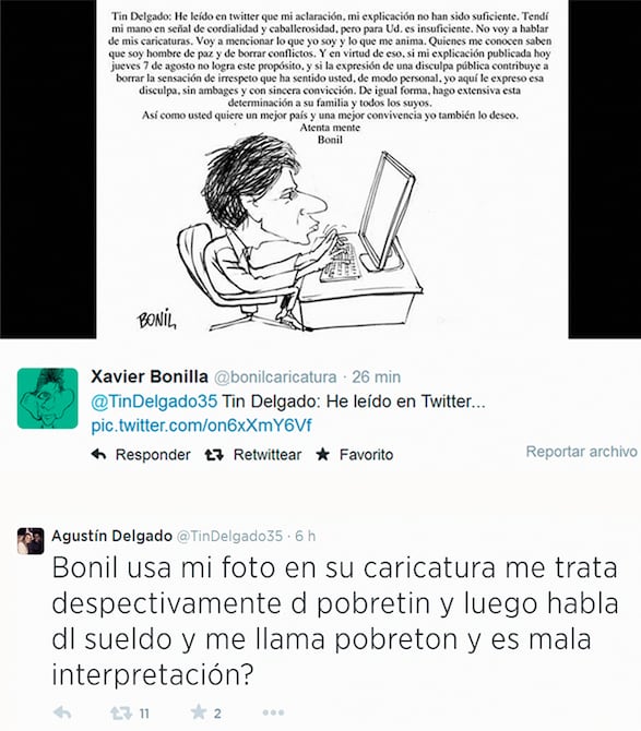 Desde su cuenta oficial de Twitter, el caricaturista Xavier Bonilla, más conocido como Bonil, ofreció anoche disculpas al asambleísta Agustín Delgado y a su familia por la caricatura publicada el pasado martes en EL UNIVERSO.