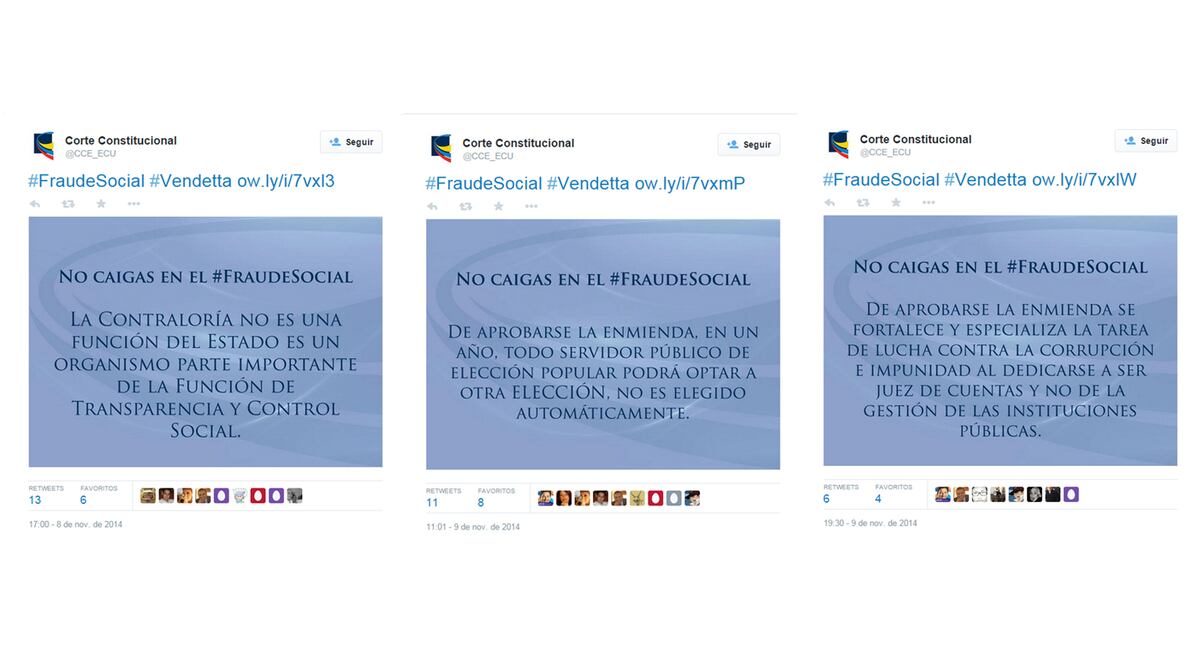 Bajo la frase “No caigas en el fraude social” la Corte Constitucional (CC) promociona en su cuenta de Twitter varias enmiendas constitucionales del proyecto de Alianza PAIS (AP) sobre el que se pronunció con un dictamen favorable, excepto en la acción de protección, hace pocos días.