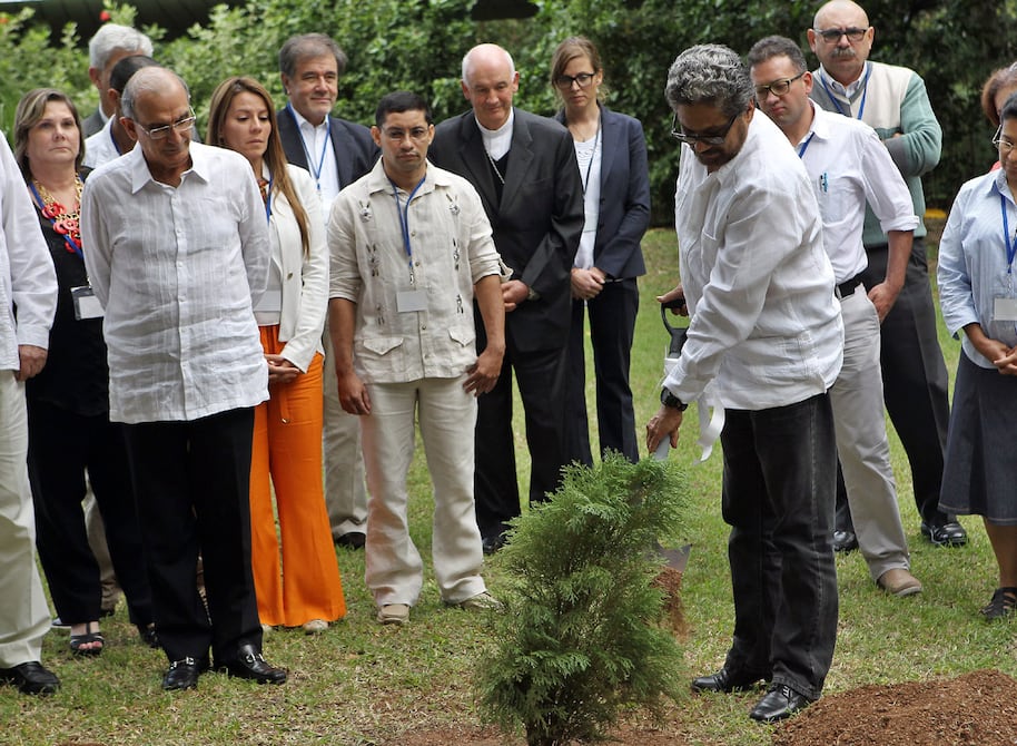 Integrantes de las delegaciones del Gobierno colombiano y las FARC, entre ellos sus jefes negociadores Humberto de la Calle e "Iván Márquez", respectivamente, plantaron hoy en La Habana un árbol por la paz junto con las doce víctimas que comparecieron hoy en la mesa de negociaciones.