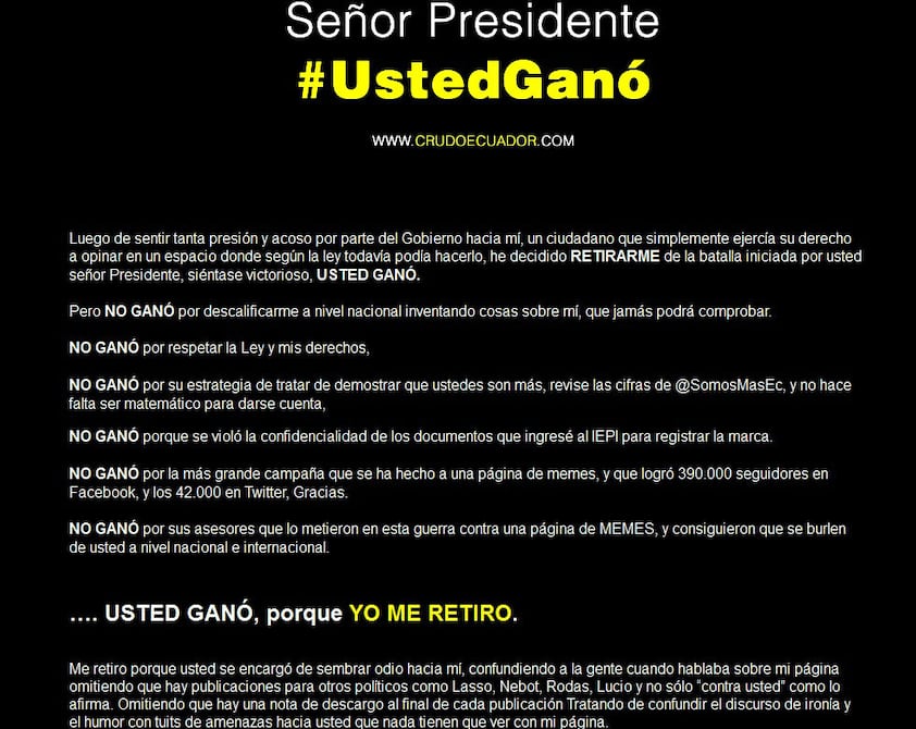 En un comunicado publicado este miércoles, la Relatoría Especial para la Libertad de Expresión de la Comisión Interamericana de Derechos Humanos (CIDH) expresó su preocupación por las amenazas que recibió el ciudadano ecuatoriano identificado a través del usuario digital “Crudo Ecuador”, luego de que hubiera señalamientos por parte de altas autoridades gubernamentales.
