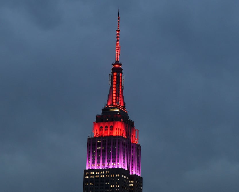 El edificio Empire State de Nueva York se iluminó el martes de noche de rojo y violeta en honor a las 219 adolescentes que siguen desaparecidas un año después de ser secuestradas en Nigeria por el grupo islamista Boko Haram.