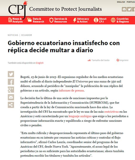 La Sociedad Interamericana de Prensa (SIP) expresó ayer que a dos años de vigencia de la Ley de Comunicación de Ecuador “es la peor ‘ley mordaza’ de América”. Y pidió a la comunidad internacional y a la Asamblea de la OEA advertir “el flagrante atropello del gobierno de Rafael Correa contra el derecho del público a estar informado, contra el trabajo libre de los periodistas y contra los medios independientes”.