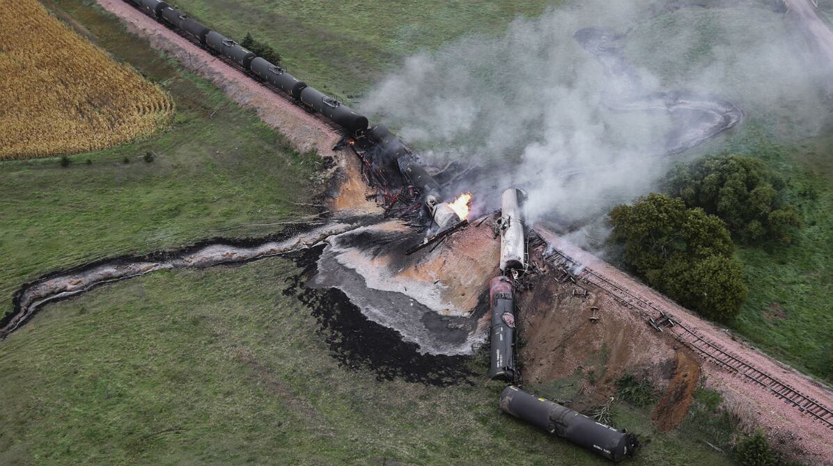 El tren de 98 vagones que cargaba etanol se descarrilló aproximadamente a las 06:15 de la mañana en una zona rural del condado Bon Homme, llena de campos de maíz.