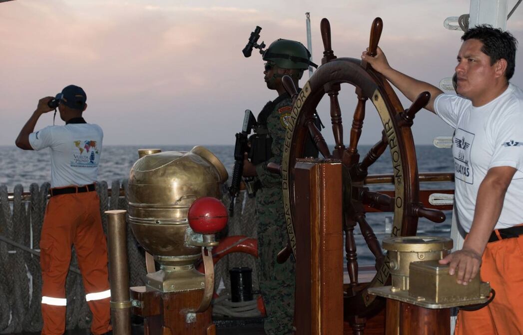 Con infantes armados en cubierta, el Buque Escuela Guayas continúa su periplo navegando en el mar Rojo.