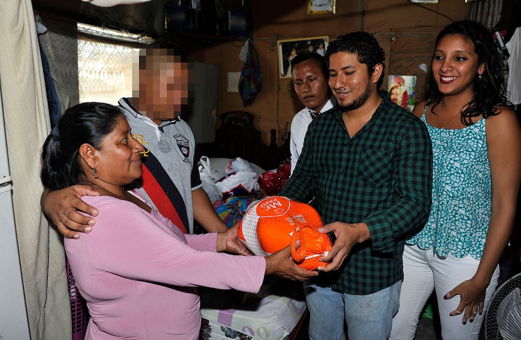 Miembros de la FEUE entregaron ayer una canasta navideña a Teodora Anchundia (i), esposa de Juan S., quien está procesado por supuesto delito de tráfico ilícito de armas de fuego, nucleares y biológicas, durante las protestas de noviembre. (I)