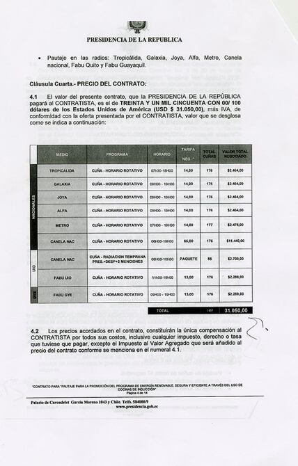 En un contrato para promocionar las cocinas de inducción, la Presidencia de la República dispone a la empresa contratista que coloque la pauta publicitaria en las radios del magnate estadounidense Ángel González, quien figuraba el 2015 como dueño de 16 medios en el país.