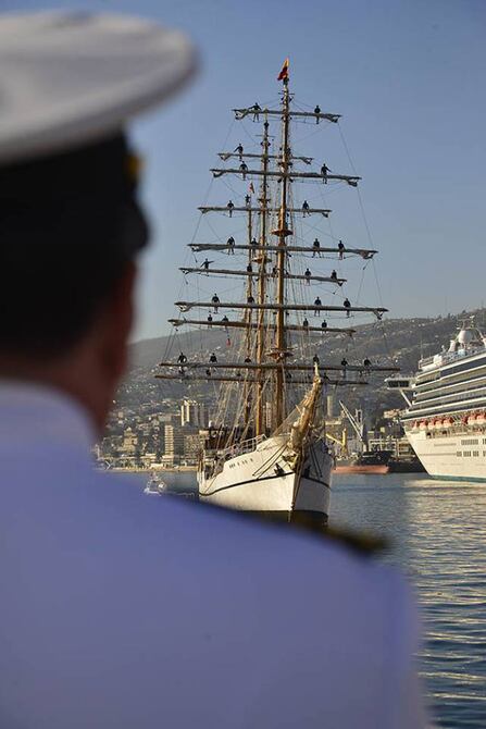 Con banderas tricolores, un grupo de compatriotas y miembros del alto mando naval chileno recibieron al Buque Escuela Guayas, que luego de recorrer 5.000 millas desde Nueva Zelanda finalmente completó la primera circunnavegación al llegar a Valparaíso, Chile, pasadas las 07:10 de ayer.