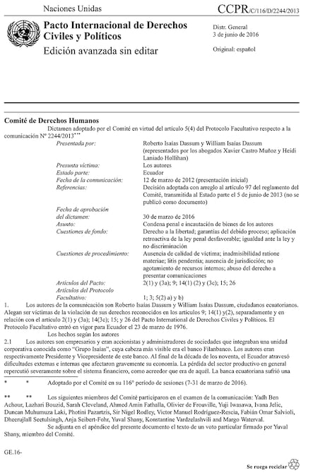 El Comité de Derechos Humanos de la Organización de las Naciones Unidas (ONU) dictaminó que el Estado ecuatoriano violó el derecho de los hermanos William y Roberto Isaías Dassum a debidas garantías para impugnar la incautación de bienes en el 2008.