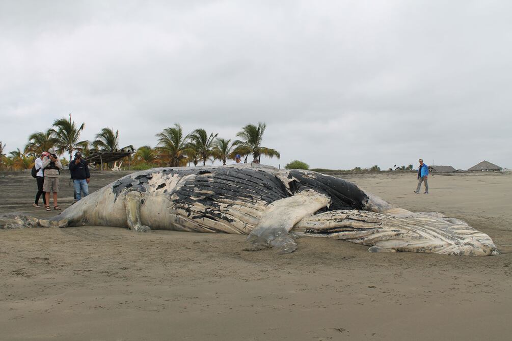 Habitantes del sector de la playa de Cauchiche, en la isla Puná, esperan que las autoridades entierren una ballena jorobada que se varó el viernes.