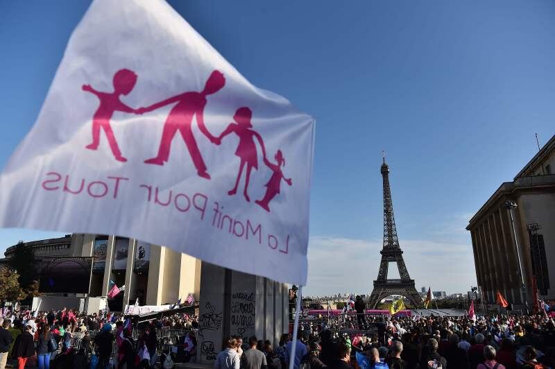 Miles de personas marcharon este domingo por las calles de París en contra de una ley que permite el matrimonio entre personas del mismo sexo, a seis meses de la elección presidencial en Francia.