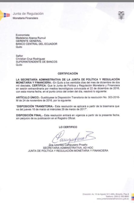 La Junta de Regulación de la Política Monetaria y Financiera aplazó hasta el 29 de marzo del próximo año la obligación para los bancos a repatriar capitales por unos $ 580 millones.
