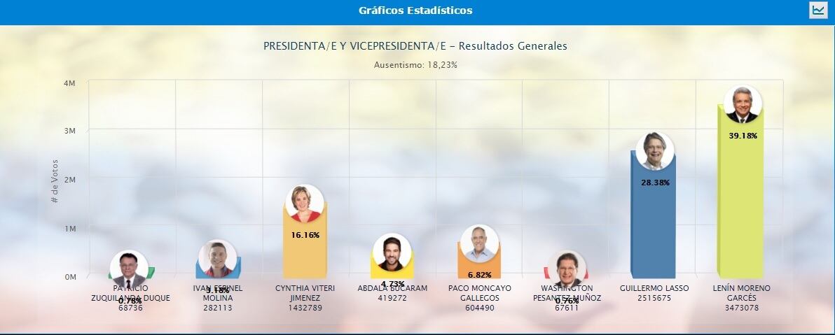 08:10 de este martes 21 de febrero, con el 93.5% de las revisadas, Lenin Moreno obtiene 39, 18 votos, y Guillermo Lasso el 28.38%. La candidata Cynthia Viteri, en tercer lugar, lleva el 16.16%; Paco Moncayo, en cuarto lugar, 6.82%; Abdalá Bucaram Pulley 4.73%, Iván Espinel 3.18%, Patricio Zuquilanda 0.78% y Washington Pesántez 0,76%.