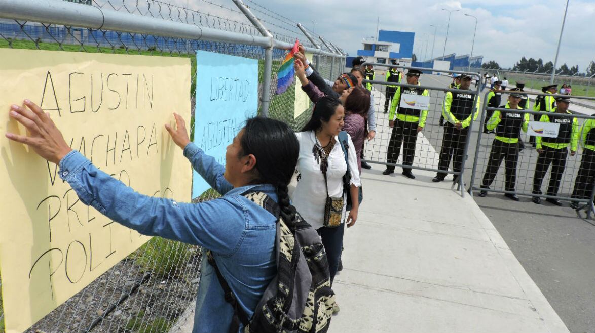 "Agustín Wachapá, preso político", "Indulto y amnistía para los presos y perseguidos políticos" fueron dos de las frases que se plasmaron en los carteles que se usaron este martes en un plantón desarrollado afuera de la cárcel de Latacunga.