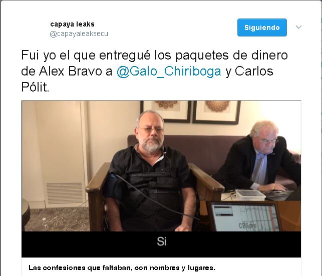 Carlos Pareja Yannuzzelli, exministro de Hidrocarburos, reveló ayer en su cuenta de Twitter @capayaleaksecu que él fue quien supuestamente entregó paquetes llenos de dinero al fiscal general de la Nación, Galo Chiriboga, y al contralor general del Estado, Carlos Pólit, reelecto recientemente para el mismo cargo.