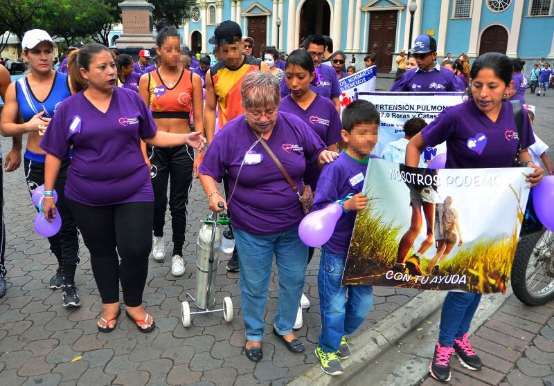 El color morado en sus camisetas y globos lo eligieron porque sus labios y uñas se vuelven de esa tonalidad cuando les falta el aire. Esa deficiencia de oxígeno es uno de los síntomas que padecen los pacientes con hipertensión pulmonar, una enfermedad rara que afecta a 25 de cada millón de habitantes.