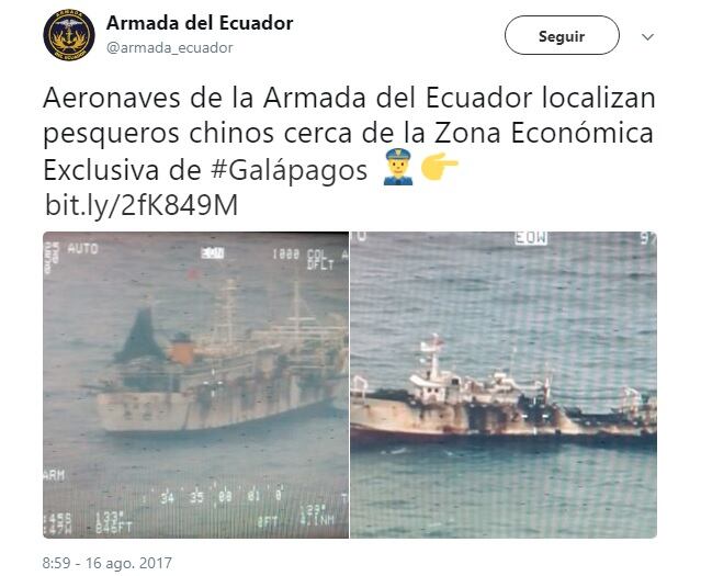 Una aeronave de la Armada detectó este miércoles barcos de bandera china realizando faenas de pesca cerca de la denominada Zona Económica Exclusiva (ZEE) de las islas Galápagos, un área que es diferente a la reserva marina que cruzó otro barco de esa nación que fue capturado la noche del domingo.