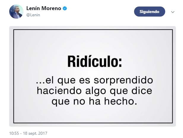 El presidente ecuatoriano escribió en su cuenta de Twitter la definición de ridículo. "El que es sorprendido haciendo algo que dice que no ha hecho", puso.