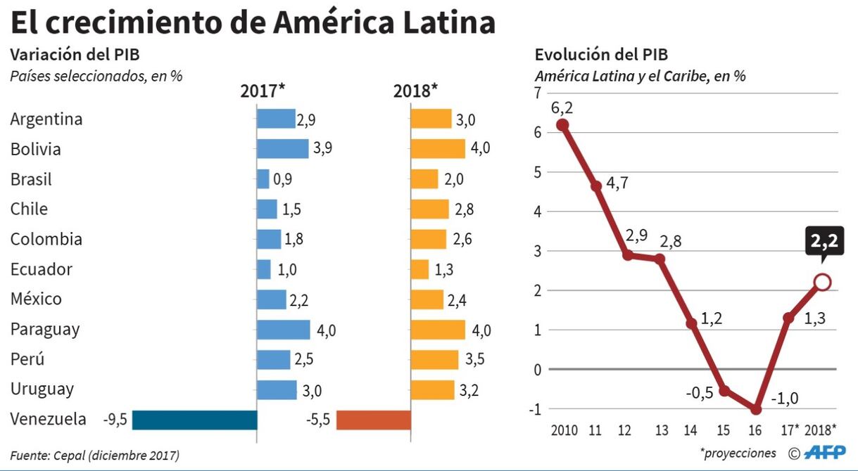 La Comisión Económica para América Latina y el Caribe (Cepal) estimó el jueves que la región crecería un 2,2 por ciento en 2018, más de lo esperado para este año por un repunte de las materias primas y una recuperación de Brasil, la principal economía del bloque.