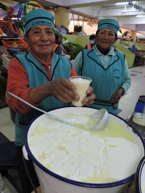 Gloria Ruiz y Herlinda Guamán son dos de las cuatro comerciantes del centro comercial popular Cristóbal Colón que venden cuajada, una bebida que se obtiene luego de que en la leche se pone el polvo que sirve para hacer el cuajo.
