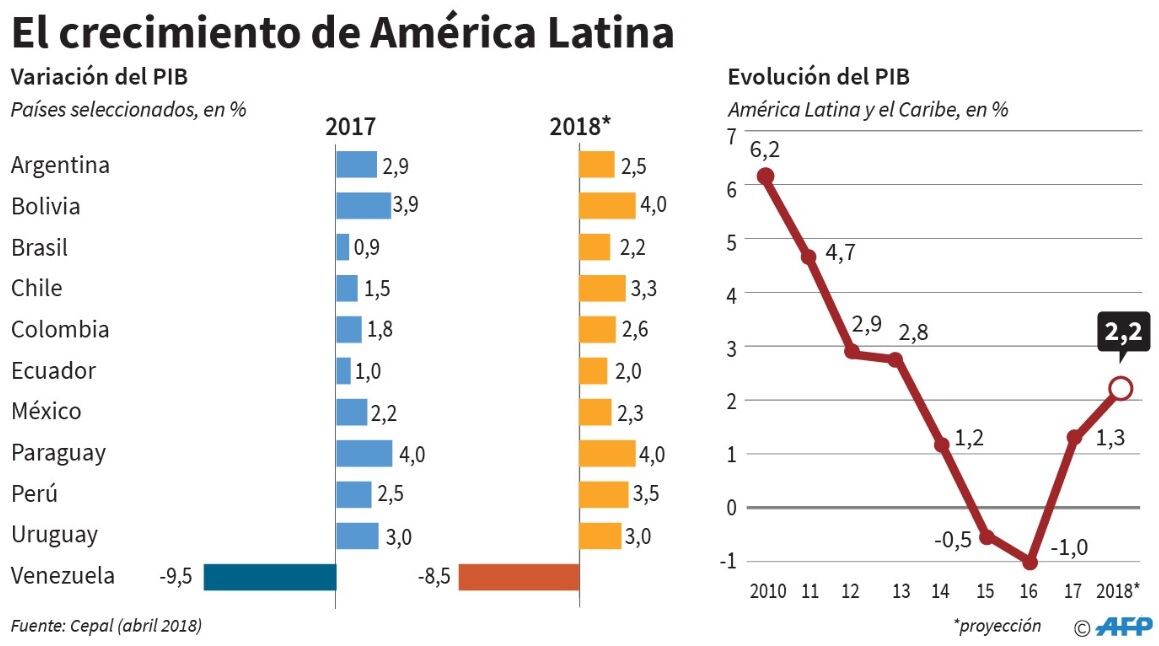 Los países latinoamericanos registrarán una expansión del 2,2% este año, de acuerdo a la Comisión Económica para América Latina y el Caribe (Cepal), que mantuvo su pronóstico de "moderada recuperación" para 2018 aunque empeoró su estimación de caída para Venezuela.