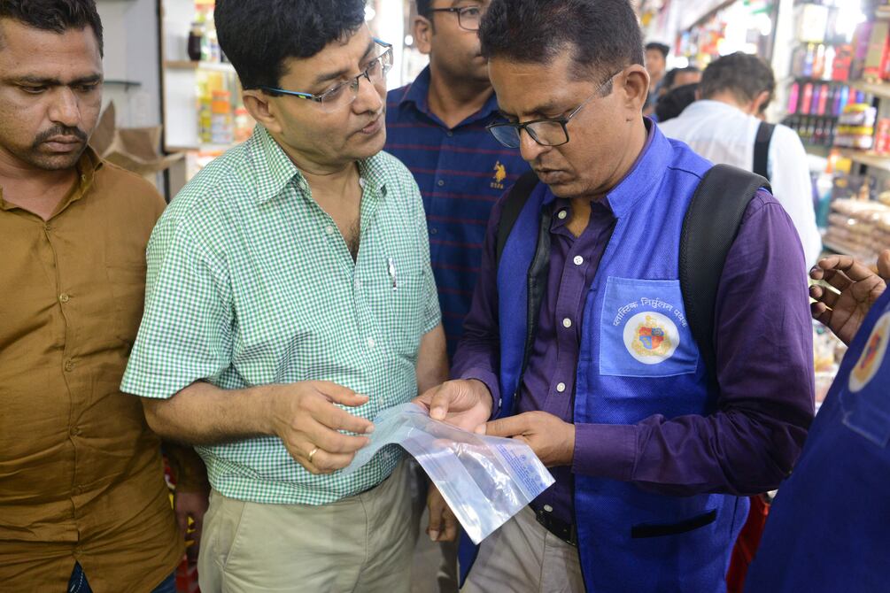 Vestidos con distintivos chalecos de color azul, una decena de inspectores municipales se reparten por el concurrido y pintoresco mercado de Crawford en Bombay en busca de infractores de una ambiciosa prohibición del plástico.