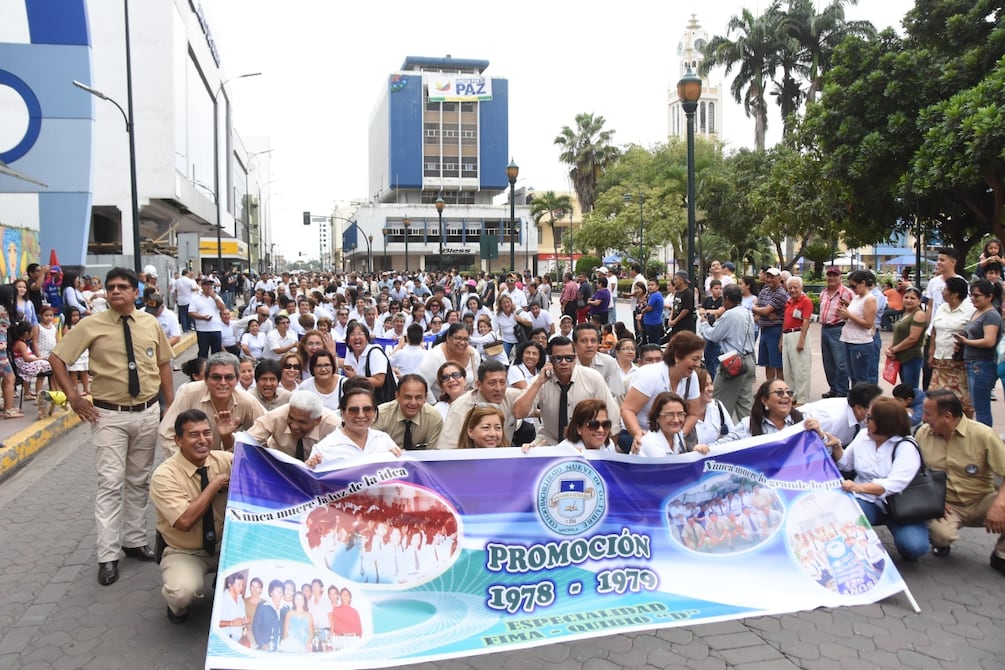 El Colegio Nueve de Octubre de Machala celebra los 132 años de creación con un desfile de los exalumnos de las distintas promociones, que aprovechando el feriado saludaron al plantel que los acogió en su adolescencia, la mayoría vistió el uniforme beige para el homenaje de aniversario.